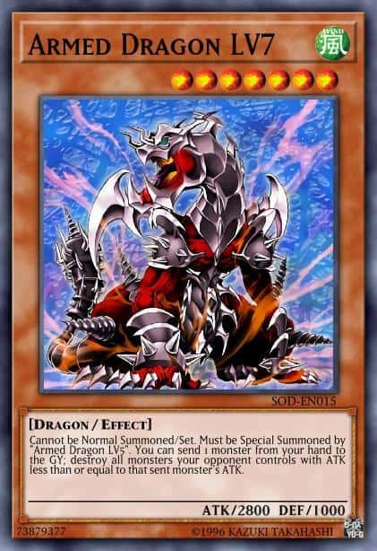 Cannot be Normal Summoned/Set. Must be Special Summoned by “Armed Dragon LV5”. You can send 1 monster from your hand to the GY; destroy all monsters your opponent controls with ATK less than or equal to that sent monster’s ATK.