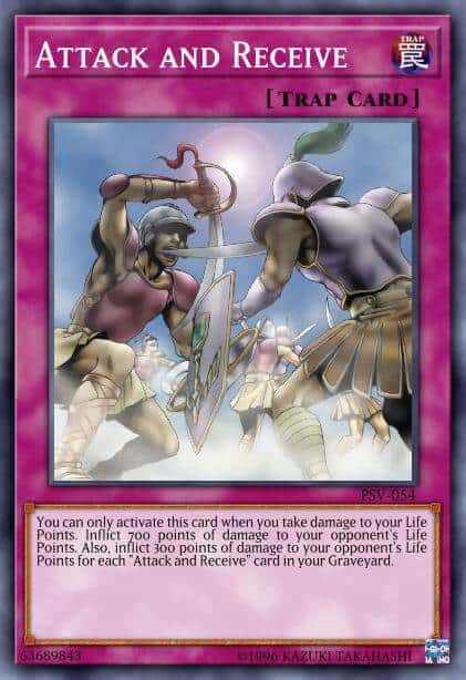 You can only activate this card when you take damage to your Life Points. Inflict 700 points of damage to your opponent’s Life Points. Also, inflict 300 points of damage to your opponent’s Life Points for each “Attack and Receive” card in your Graveyard.