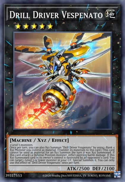 Once per turn, you can also Xyz Summon “Drill Driver Vespenato” by using 1 Rank 4 Xyz Monster you control as material. (Transfer its materials to this card.) This card cannot be used as material for an Xyz Summon the turn it was Xyz Summoned. If this card attacks a Defense Position monster, inflict piercing battle damage. If this Xyz Summoned card in its owner’s control is destroyed by an opponent’s card: You can target 1 Level 5 or lower monster in your GY; Special Summon it. You can only use this effect of “Drill Driver Vespenato” once per turn.