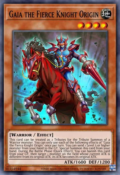 This card can be treated as 2 Tributes for the Tribute Summon of a Warrior monster. You can only use each of the following effects of “Gaia the Fierce Knight Origin” once per turn. You can send 1 Level 5 or higher monster from your hand to the GY; Special Summon this card from your hand. During the Battle Phase (Quick Effect): You can banish this card from your GY, then target 1 monster on the field whose current ATK is different from its original ATK; its ATK becomes its original ATK.