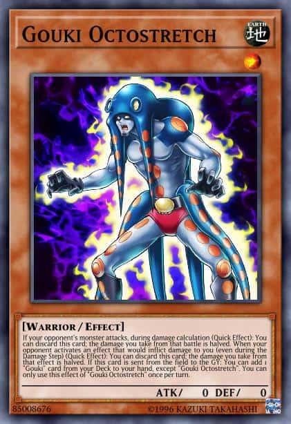 If your opponent’s monster attacks, during damage calculation (Quick Effect): You can discard this card; the damage you take from that battle is halved. When your opponent activates an effect that would inflict damage to you (even during the Damage Step) (Quick Effect): You can discard this card; the damage you take from that effect is halved. If this card is sent from the field to the GY: You can add 1 “Gouki” card from your Deck to your hand, except “Gouki Octostretch”. You can only use this effect of “Gouki Octostretch” once per turn.