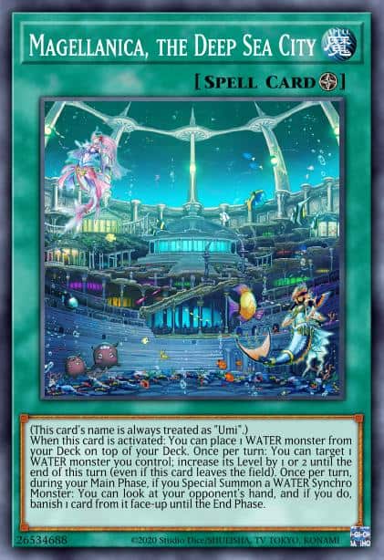 When this card is activated: You can place 1 WATER monster from your Deck on top of your Deck. Once per turn: You can target 1 WATER monster you control; increase its Level by 1 or 2 until the end of this turn (even if this card leaves the field). Once per turn, during your Main Phase, if you Special Summon a WATER Synchro Monster: You can look at your opponent’s hand, and if you do, banish 1 card from it face-up until the End Phase.