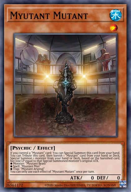 If you control a “Myutant” card: You can Special Summon this card from your hand. You can Tribute this card, then banish 1 “Myutant” card from your hand or Deck; Special Summon 1 monster from your hand or Deck, based on the banished card, but lose LP equal to that Special Summoned monster’s original ATK.