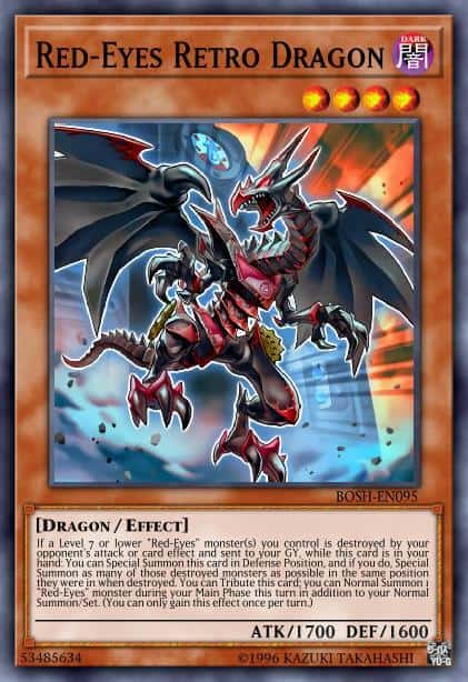 If a Level 7 or lower “Red-Eyes” monster(s) you control is destroyed by your opponent’s attack or card effect and sent to your GY, while this card is in your hand: You can Special Summon this card in Defense Position, and if you do, Special Summon as many of those destroyed monsters as possible in the same position they were in when destroyed. You can Tribute this card; you can Normal Summon 1 “Red-Eyes” monster during your Main Phase this turn in addition to your Normal Summon/Set. (You can only gain this effect once per turn.)