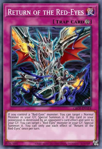 If you control a “Red-Eyes” monster, except “Red-Eyes B. Chick”: You can target 1 Normal Monster in your Graveyard; Special Summon it. If this card in your possession is destroyed by an opponent’s card effect and sent to your Graveyard: You can target 1 “Red-Eyes” monster in your Graveyard, except “Red-Eyes B. Chick”; Special Summon it. You can only use each effect of “Return of the Red-Eyes” once per turn.
