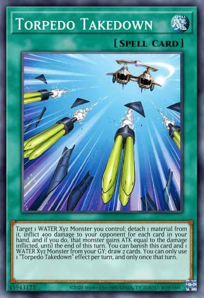 Target 1 WATER Xyz Monster you control; detach 1 material from it, inflict 400 damage to your opponent for each card in your hand, and if you do, that monster gains ATK equal to the damage inflicted, until the end of this turn. You can banish this card and 1 WATER Xyz Monster from your GY; draw 2 cards. You can only use 1 “Torpedo Takedown” effect per turn, and only once that turn.