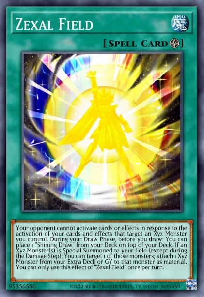 Your opponent cannot activate cards or effects in response to the activation of your cards and effects that target an Xyz Monster you control. During your Draw Phase, before you draw: You can place 1 “Shining Draw” from your Deck on top of your Deck. If an Xyz Monster(s) is Special Summoned to your field (except during the Damage Step): You can target 1 of those monsters; attach 1 Xyz Monster from your Extra Deck or GY to that monster as material. You can only use this effect of “Zexal Field” once per turn.